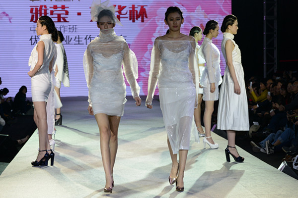 随后进行了香港理工大学优秀毕业生作品展示。香港理工大学带来的设计作品由“夸张,传统,简洁,创意”组成,虽然看起来是四个矛盾的理念,但是香港理工大学的同学们很好地把它们融合在了一起。开场就以一套极具嘻哈风格的服饰吸引了观众的注意力。碰撞的色彩,跳跃的纹样,让所有人眼前一亮。另外,以黑白色,扇形褶皱,带有别样欧式风格来表现的立体印花女装系列,尝试了运用新材料去研究并创造服装上新的可能性,别有一番趣味。这次发布上出现了许多的传统元素,将民族服饰的风格与时尚潮流相结合。在借鉴传统服装的花纹、样式的基础上,香港理工大学的学生们大胆进行了改革创新。比如第三套服装,模特身上飘逸的长裙,与脚上所穿的的古朴雅致的木屐,与脸上佩戴的硬质头盔相碰撞,硬朗中又不失柔和,为观众们带来了特别的观赏体验。