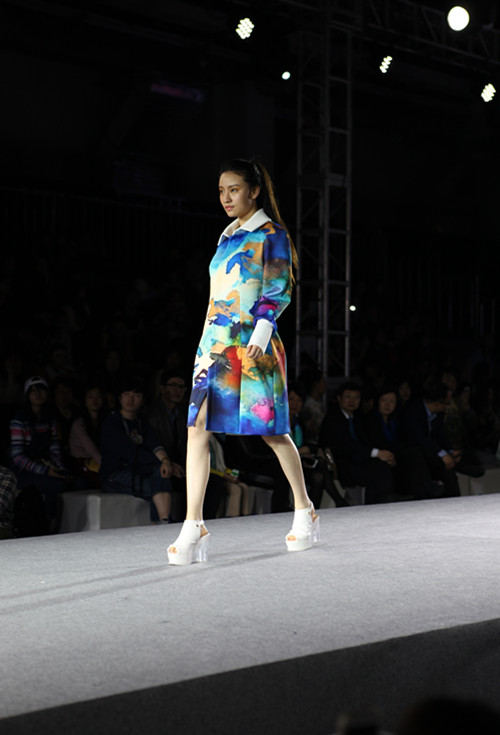 在展演中,有一个系列的服装显得很特别。它以“孔雀”为主题,却没有采用如孔雀羽毛般华丽的色彩,反而非常干净、简洁。在采访中我们得知,设计师的灵感的确来源于孔雀,但欣赏的是孔雀的精神与柔美的线条,而不在乎其颜色。看起来简单的衣服,其实使用了针织、皮革、麻、鸵鸟毛等诸多面料的结合,力求材料、配饰、衣服的整体和谐与美感。另外引起轰动的有采用太空棉与编织面料拼接的一组服装。其中一套上身包身,下身小廓型的服装,既表现了曲线美,又富有时尚感。袖口处的编织部分,配以绑带流苏,增添一份随意和可爱。