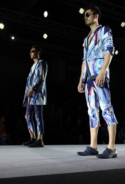 获得市场潜力奖则是来自焦琳瑜同学的作品,缤纷的色彩,打破沉寂;舞动的衣摆,冲破阻隔;青春活力,张扬性格在细节处展现年轻男装的活力。多彩的蝴蝶领结,看似随意摆放的口袋,几何变色的花纹体现了经典与现代的洽度结合。