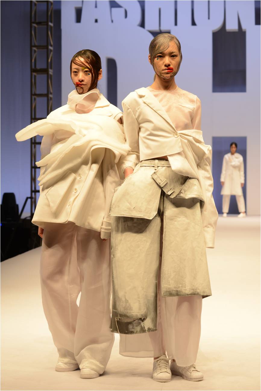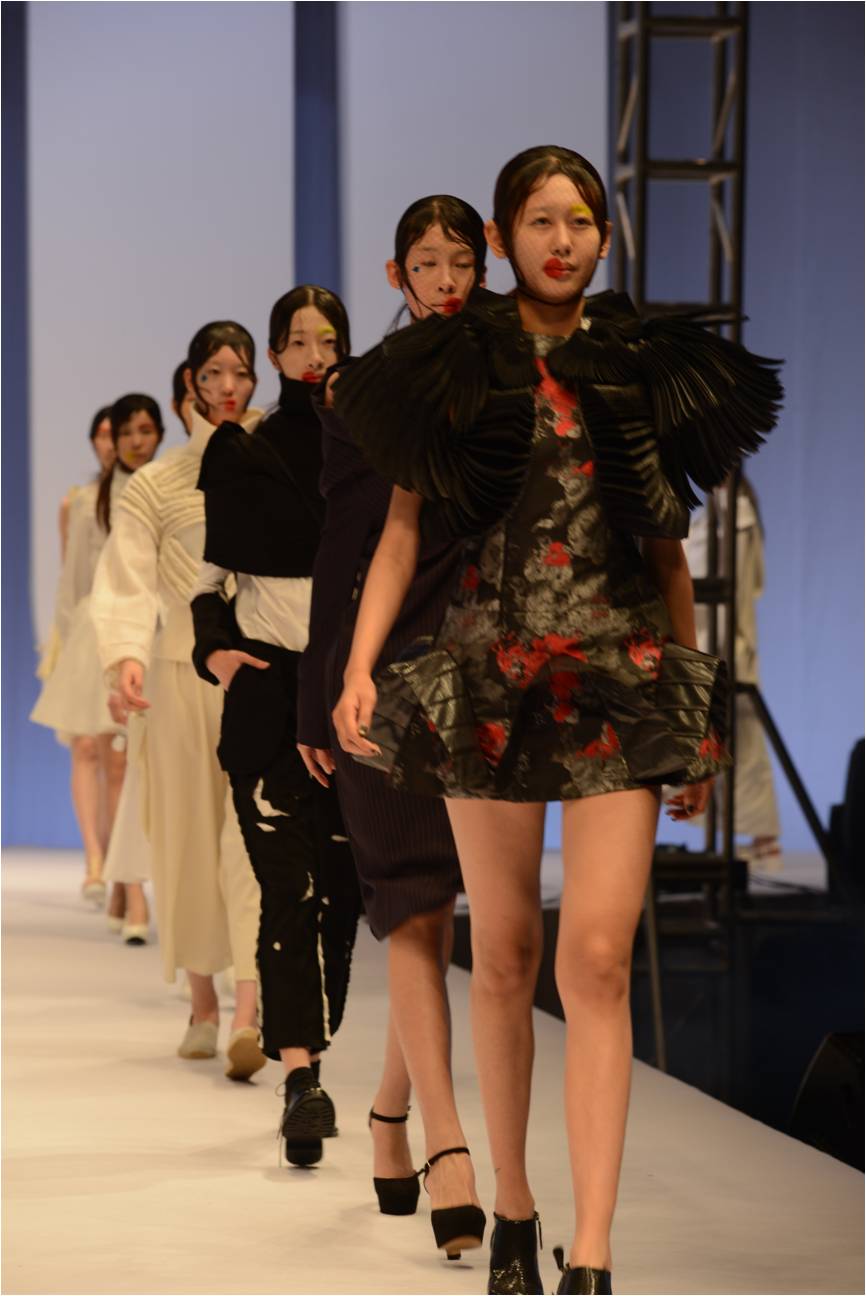 中日合作班的同学们带着他们的心血之作在时尚周大气的白色T台上亮相,场内座无虚席。