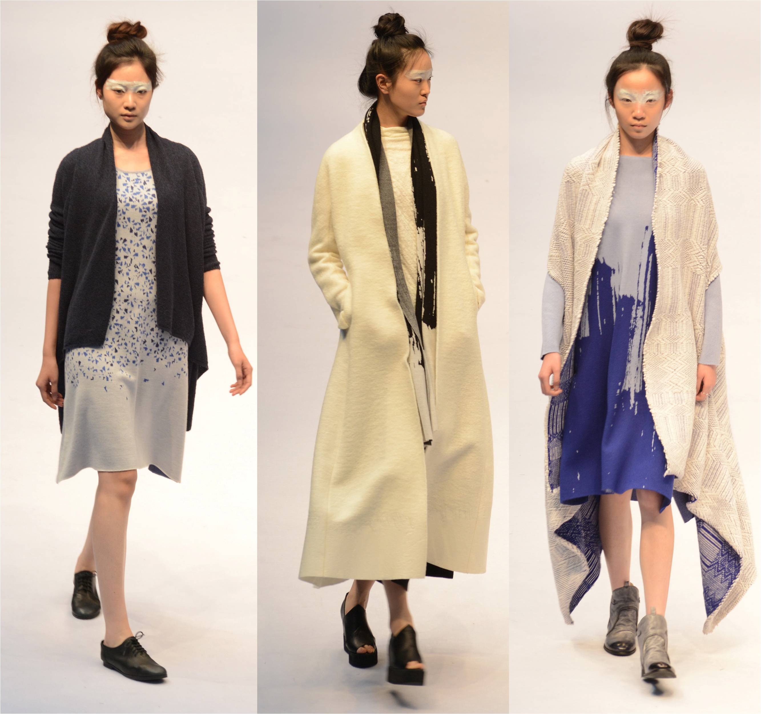 作品大量选用高级的意大利及日本面料,使用全天然素材,如:棉麻丝与羊毛,及全天然的混纺主体材料。