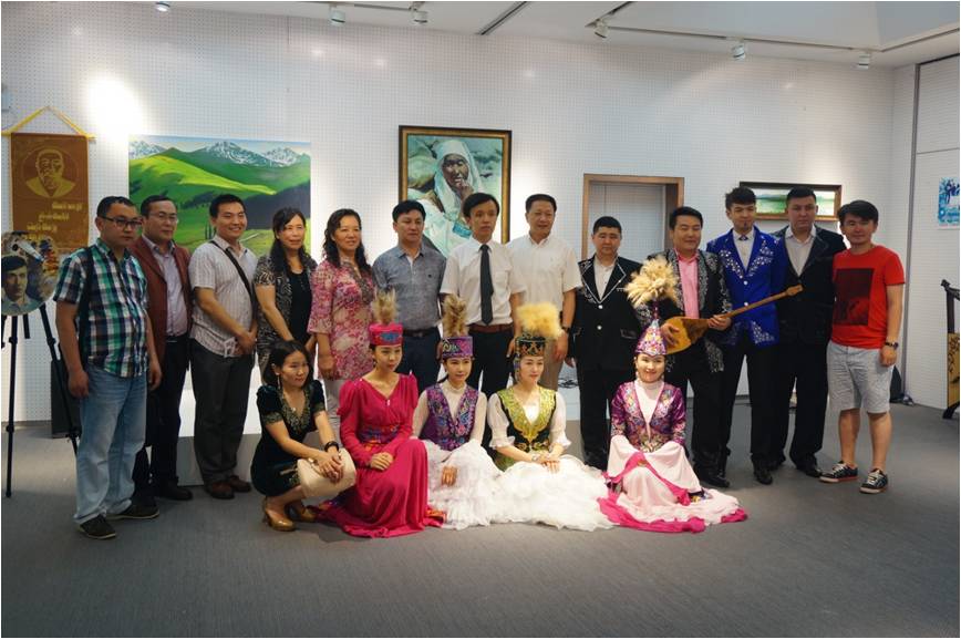 逸夫楼一楼展厅举行了一场特别的新疆哈萨克族民俗文化展,展览的举办者是来自新疆阿勒泰地区歌舞团的少数民族特培学员木拉力别克•那毕,他自2014年6月来我校培养、进修,服装•艺术设计学院倪军副教授担任他的专业指导教师。