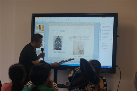 在明确了文化的内涵以及非遗项目的重要性后,陆老师从蚕丝讲起,对中国刺绣鼎盛时期的唐朝、宋朝、明朝等朝代逐步分析,从而引出了整个讲座的主题——顾绣。陆老师对顾绣的起源和发展做了详细的介绍,它是江南刺绣艺术的杰出代表,并对后世江南刺绣的发展产生了深远的影响。顾绣被列为第一批国家级非物质文化遗产名录项目,它的价值独特,有待进一步的保护与开发。