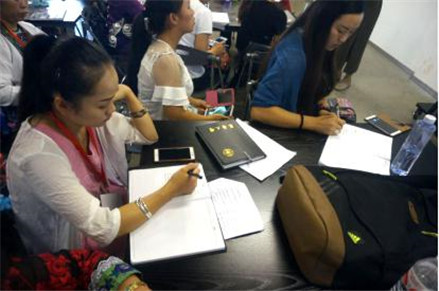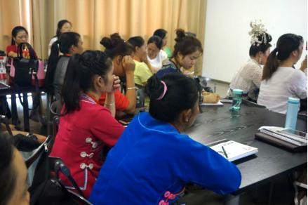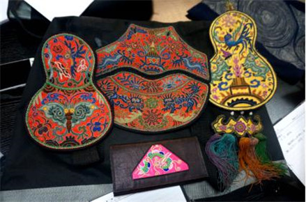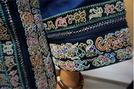 美丽的水族姑娘韦竹秀青春照人、落落大方。作为贵州毕节的县级马尾绣传承人,每天上课都穿着巧夺天工的传统水族马尾绣服装,图案精美,配色纷繁。今天她带来了许多刺绣材料,听完汪老师的讲课就迫不及待的开始动手实践。