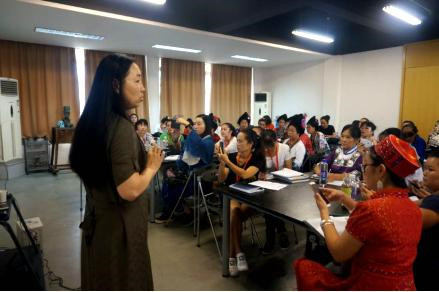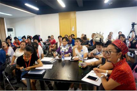刘忠兰是贵州非物质文化遗产苗绣传承人,黔东南名匠。刺绣创意设计课程后,她非常高兴地跟大家分享她的刺绣作品,给大家讲述具体的刺绣工艺和手法。此次远道而来的她就是为了学习更多的新知识,今天的图案赏析课程给她带来了很多思考和启发。