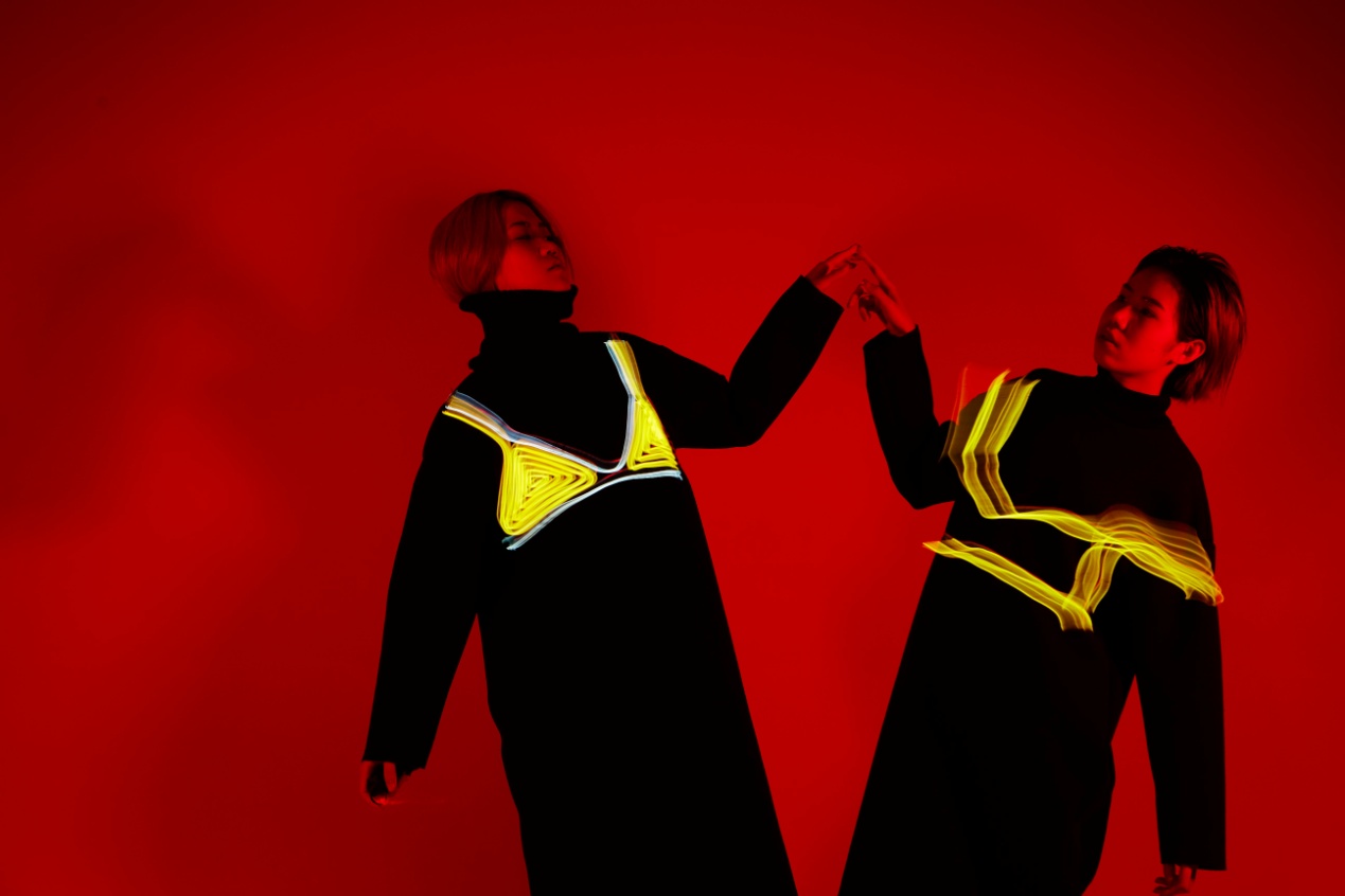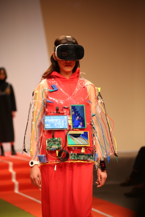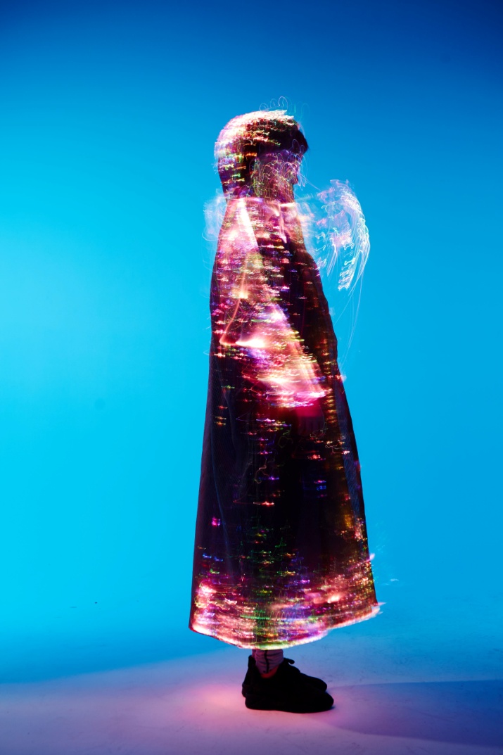 此次课程展示以科技创新、时尚设计为宗旨,采用虚拟现实(VirtualReality)技术,将电子屏幕、导电纤维以及LED灯等元素应用于服装设计,使可穿戴服装迈出了开拓性的一步。学生设计师们将先进的可视概念应用在设计当中,利用计算机图形和辅助传感器和VR眼镜,使穿戴者与环境产生交互式体验。设计师们设计的夜跑家居服,将闪烁的LED灯应用在服装上,灯光的色彩、线条以及面积的变化和组合,呈现出多种设计风格。