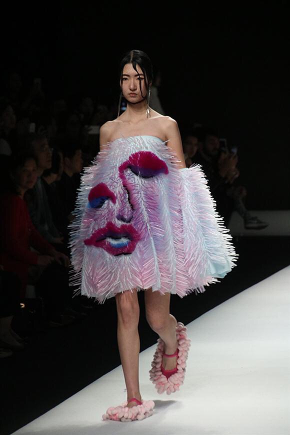 在这次发布的《Face To Face》设计系列中,服装与服饰设计(中日合作)专业的学生姚瑶用“吸管”这种非服(装)用材料,结合热熔工艺技术,使几万根吸管在服装中有了新的表现形式。她认为,要成为“设计工匠”,就必须要在物尽其用的基础上,追求物超其用的更高境界,以匠人精神赋予服装更生动的表达。