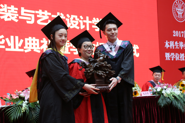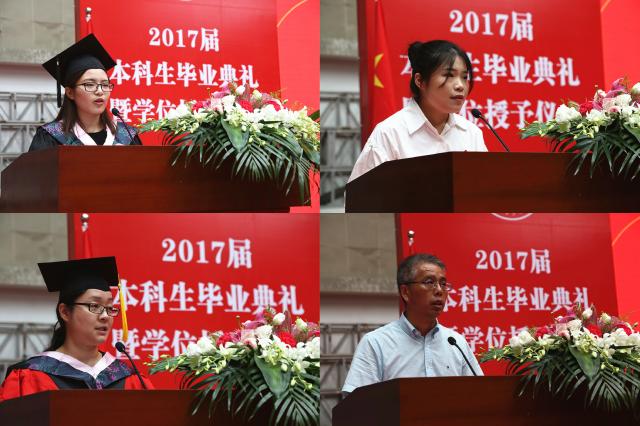 随后,毕业生代表,来自服装与服饰设计(中日合作)专业的姚瑶上台发言,她回顾了大学四年的难忘经历,并代表学院全体毕业生感谢老师的无私奉献、学校的辛勤培养。一字一句无不包含了毕业生们对这段青春岁月的不舍及留恋、对同学情谊的珍惜、对母校的感恩、以及对未来的憧憬。环艺1401班许佳代表在校生,为毕业生送上真挚的祝福。
