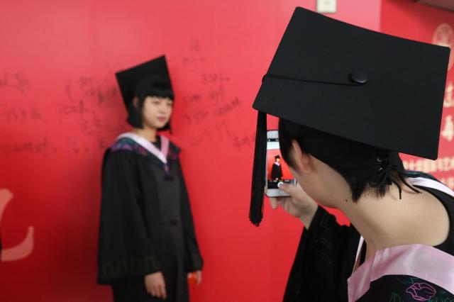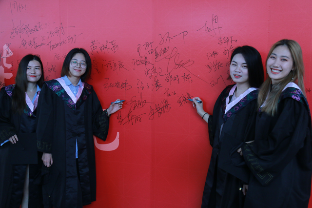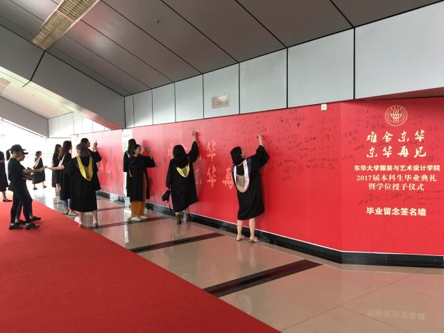 今年的毕业典礼,学院在会场外设置“难舍东华,东华再见”毕业留念签名墙。毕业生纷纷驻足签名留言,记录大学的美好回忆,诉说对母校的热爱与不舍。