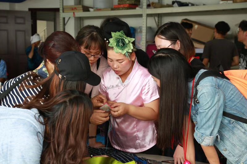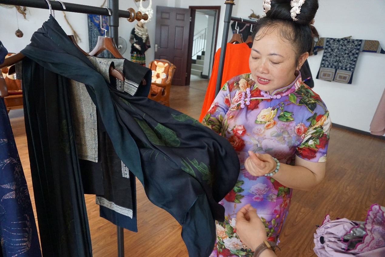 除了尝试蜡染、蜡画创作,高成春还与一些高级定制品牌合作开发服饰,如曾为彭丽媛国母定制服装的“例外”。“例外”是中国非常成功的女装设计师品牌,践行纯手工制作,环保简朴,致力于创新和东方文化的传承。“例外”品牌与高成春的公司建立了良好的合作关系,这不仅是对她精湛技艺的肯定,也证明了高成春在非遗传承上的努力与成就。“刚开始,我的市场主要还是在当地,一些绣娘因为忙于工作或者做生意,没时间绣花,也会下单找我订做。”生意越来越好之后,她便将业务延伸到周边城市。“订单不断增加,光靠几个人忙不过来,我就请了县里其他空闲的妇女来跟我一起做,现在已经成立起近200人的团队。”高成春介绍,她的这个团队有时一起做,有时分工来做,长期固定的绣娘大概四五十个人,基本每天大家都很忙碌。这些妇女们一边做工赚钱,一边带小孩读书,每个人吃的都是手工钱。