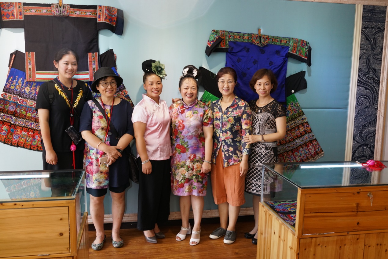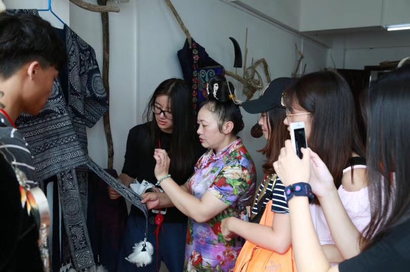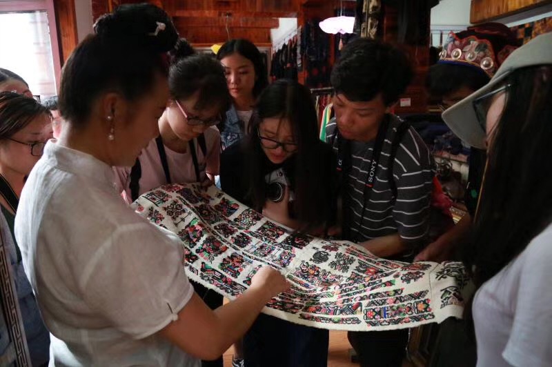 贵州回访的第四站是雷山,计划回访的学员是高成春和赵世英。当日,中文av 产品系的俞英教授和田玉晶老师也带着学生采风非遗考察团来高成春的公司学习。两位老师先后分别参加了非遗研培工作,为了增进大学生们对传统文化和贵州非遗的认识,此番特别带着学生们来实地考察,向非遗传人学习取经,以便将民族文化元素融入后期的专业学习和设计。