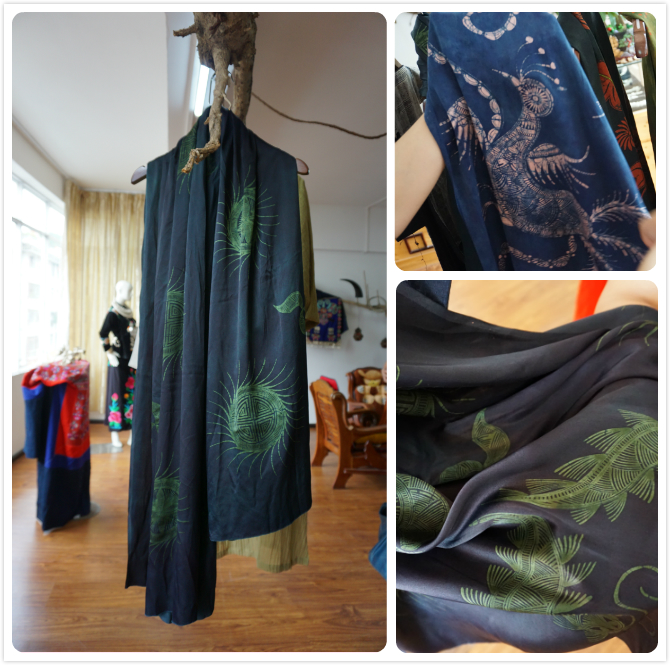 2016年,高成春成立了“贵州成春非物质文化遗产传播开发有限公司”,自己做刺绣、蜡染、蜡画服饰及包袋等产品。除了把传统的一些纹饰图案,原汁原味的放在服饰上,同时,她还做了很多全新的尝试。“现代作品既要有民族味,也要有时尚风。”高成春认为,传承苗家技艺既要沿用古法精雕细琢,也要紧跟时代大胆创新。她在延续原生态、纯手工工艺的同时,也在此基础上尝试创新,包括面料载体的变化、色彩图案的设计等等。比如传统的蜡染是用铜制的蜡刀蘸蜡汁在白布上描绘图案,待蜡干了以后,把布放进蓝靛染缸之中将布染成蓝色或青色,然后再把布放进锅里煮,使蜡从布上熔脱,原先绘蜡的地方就呈现出白色,蓝白相间的图案色彩十分鲜明,最后再经过漂洗就成了蜡染布。高成春认为棉布比较硬,品质感不够,而且传统的白蓝色图案比较单调。于是她将蜡染的面料载体拓展到丝绸上,并且在绘蜡之前先运用草木染的方式对白色的丝巾进行染色处理,用板蓝根、栀子花、椿树等植物的叶、皮、根、茎等做原料,将一段白色的丝绸经煮染或浸染,染成绿色、黄色、红色等绚丽缤纷的颜色,然后再在丝巾上使用传统的蜡染工序进行绘蜡、染色、脱蜡等,最终创作出的丝巾质地飘逸、色彩和谐,品质感明显提升。高成春向回访组介绍,由于染色过程中浸染的时间、手法、材质不同,染出来的颜色也不尽相同,所以每一条丝巾都是独一无二的,而且彩染丝巾无法批量生产,从布料的纺织、绘蜡、染色、氧化、漂洗、脱蜡等,都是一步一步亲手制作的,辛苦但是满足。高成春说,在草木染工艺中,许多从植物里提取的色素对纤维亲和力不是很强,色牢度较差,彩染丝巾如何固色是她在创作过程中遇到的最棘手的问题;这个问题解决后,她接下来想进一步尝试将刺绣融合进彩染丝巾里,增加丝巾的美感。