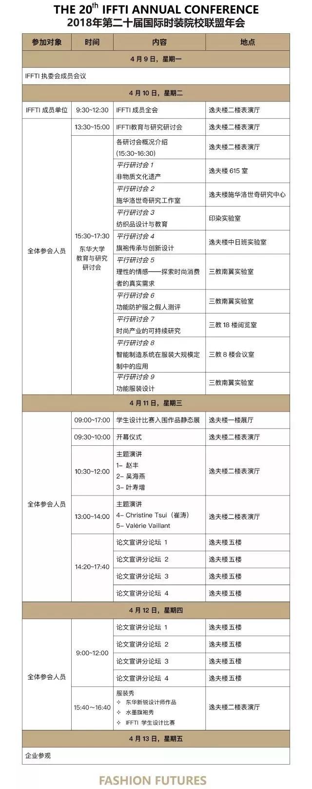 本届年会主题为 “Fashion Futures”,涉及集成和开发设计、技术与材料创新、商业与产业发现、文化传承与发展、教育多元化五项议题。议程持续五天,主要包括主题演讲、论文宣讲、设计大赛和参观研讨等学术交流活动。