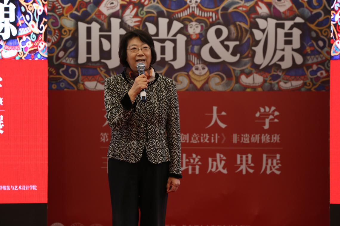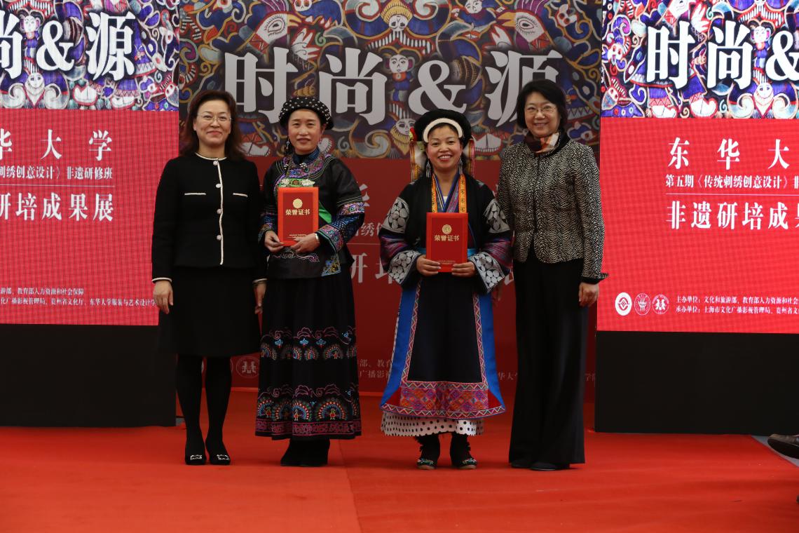 11月13日,我校第五期《传统刺绣创意设计》非遗传承人群研修班“时尚·源”成果汇报暨结业典礼在上海第一百货商业中心举行。校党委副书记崔运花出席结业汇报展演。上海市文广局非遗处处长杨庆红,中文av 党委书记袁孟红、院长李俊,国际合作处处长赵明炜,非遗研究中心主任柯玲、教学主管陈彬等非遗研培教师代表及企业代表参加。上海教育电视台、SMG长宁频道、摄影记者、新民晚报、解放日报、劳动报等沪上主流媒体记者活动期间现场采访报道。柯玲主持结业典礼。