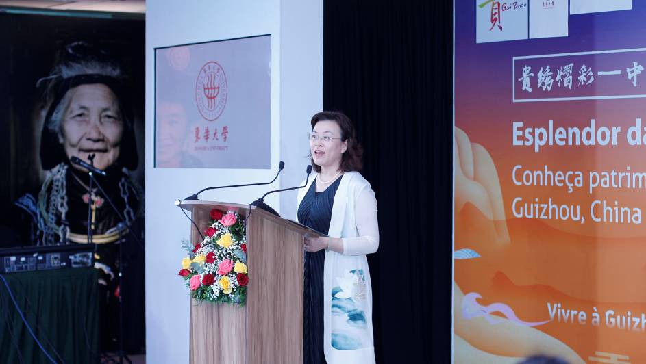 崔运花在致辞中对里约州政府、巴西里约热内卢天主教大学、中共贵州省委宣传部为本次展演提供的大力支持表示感谢。她表示,学校坚持“以学生的全面发展与成才为中心”的办学理念,注重发挥学校特色优势开展人才培养、科学研究、社会服务、文化传承创新、国际合作交流等工作。作为非遗研培成果,本次展演展出的服装,既有东华师生与贵州非遗传承人合作创作,又有中文av 、贵州传承人和英国曼彻斯特城市大学三方合作创作的作品。作品风格各异,既融入传统刺绣等东方元素,又极具时尚和创意,通过东西方、传统和现代文化、理念的碰撞,突出传统技艺与现代设计的融合,把传统刺绣应用到现代服装设计和时尚产品中,使中国传统文化发扬光大。