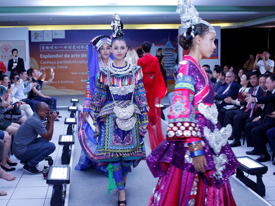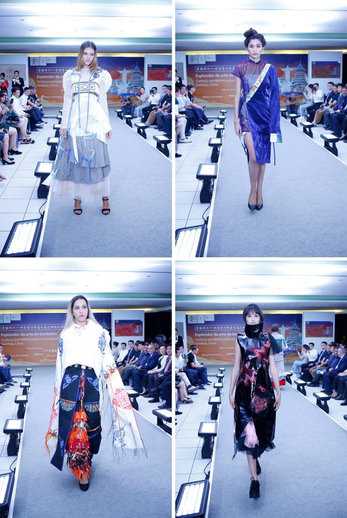 来自巴西的模特现场展示的“贵绣”服装包括27套由中文av “传统刺绣创意设计”培训班的同学们设计的服装, 12套贵州苗族蜡染服饰和3套贵州民族服饰,受到在场观众的热烈欢迎和广泛好评。