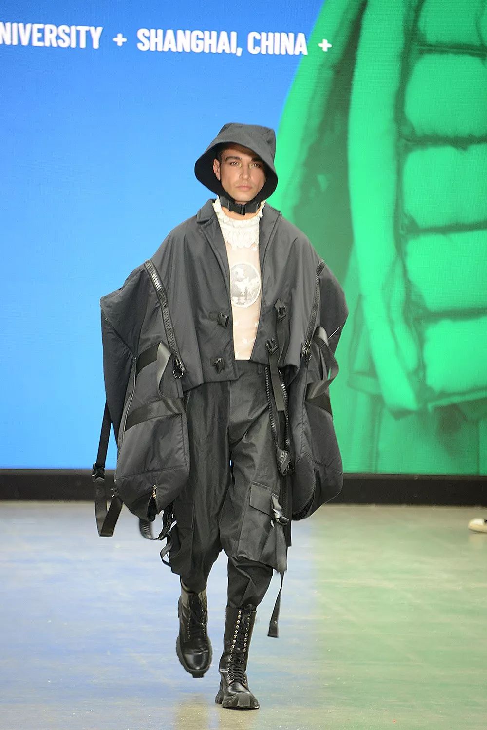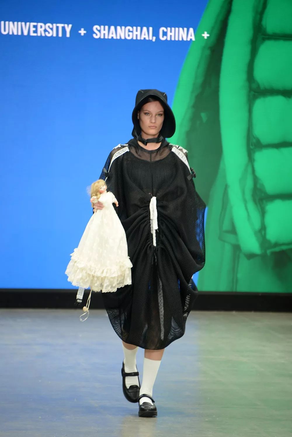 王笑妍的《星期三》则表达了以哥特式幽默电影《The Addams Family》中Wednesday 的形象为灵感。她在很小的年龄就有了异于常人的想法,带有冷静而成熟的人格特质。把 Wednesday 所代表的这一类女孩内心的各种想法实体化、具象化,用服装上的包和不同的娃娃来表现。娃娃的形象代表了不同的内心世界,在面料上使用了网眼、蕾丝和防水尼龙等。