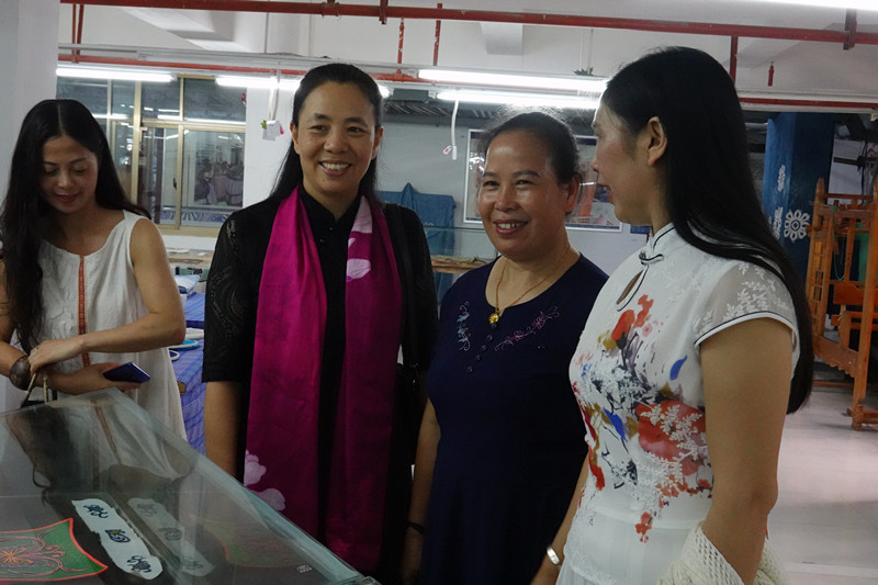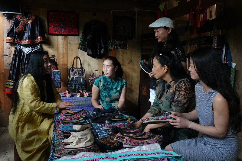 回访中文av 五期学员查兰菊(左二):现场切磋如何结合布依族刺绣开发鞋子和包包