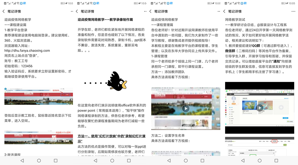 在线课程准备中,老师们互相帮助,积极分享经验。获得过上海市教委系统“三八红旗集体”以及上海市“巾帼文明岗”荣誉称号的服装设计与工程系一如既往地发挥着先锋模范作用。系党支部书记鲁虹老师第一时间组织支部骨干教师们成立“信息化教学能力提升先学小组”,于晓坤老师、鲁成老师、邵丹老师先后自制了PPT录制教程、网络平台课程建设、平行班级设置等教学图片、视频,分享给全院老师,并积极为学院老师答疑解惑,助力学院在线课程建设工作。针对视频上传后无法打开的情况,环境设计系的王亚明老师也积极分享经验,并提醒老师们使用学生端进行查看,以保证学生能看到视频。在这个特殊时期,学院全体老师齐心协力,互帮互助,体现了美好学院老师们的大爱。