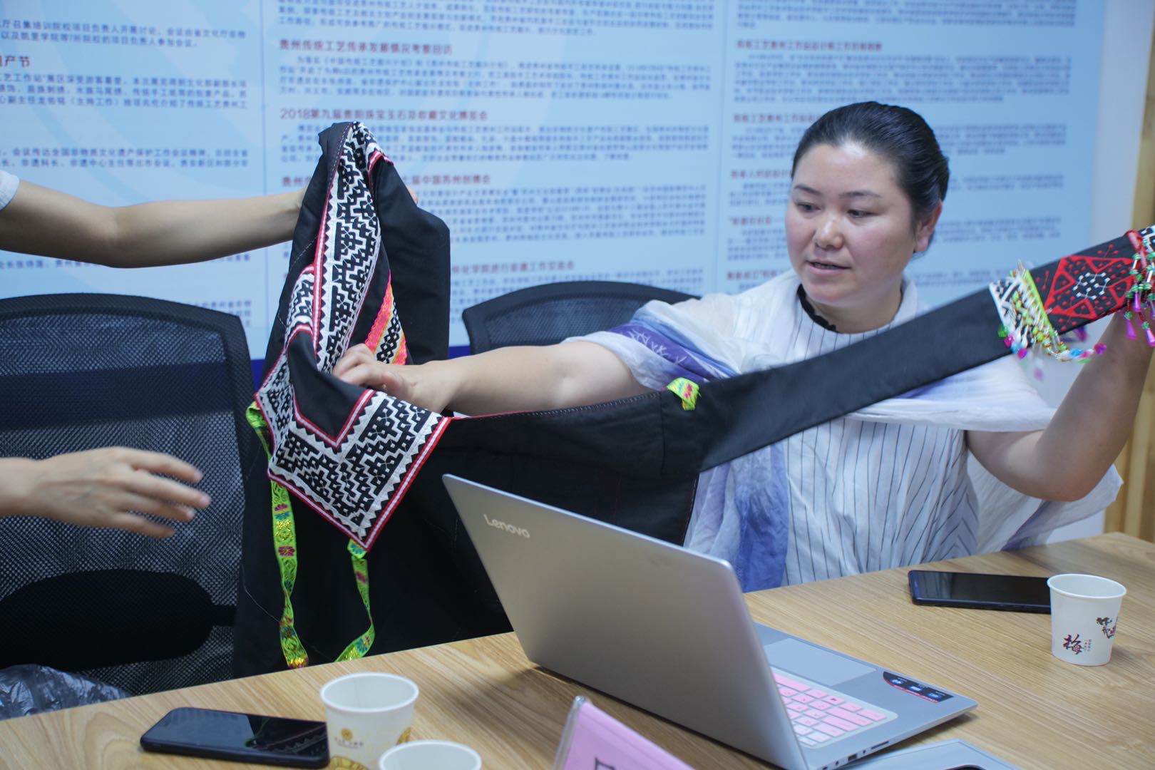 柯老师代表中文av 感谢贵州领导对东华研培工作的支持和帮助,重温了双方于2019年4月签署的《共同推进民族文化发展》的省校合作备忘录。详细介绍了即将于秋季举办的中文av 第八期精英学员研修班的计划,以及此次回访重点调研的上海对口帮扶的遵义地区学员的帮扶举措。东华学员梅子留香品牌创始人陈梅也分享了自己在遵义地区的培训体会和感悟,还带来了当地的贴布绣绣片和服装。中文av 傅婷老师从专业角度分析了贴布绣的特殊审美价值和广阔的应用前景。最后,贵州非遗保护中心龙主任对中文av 严谨踏实的研培工作作风表示充分肯定,感激中文av 对贵州非遗的关注、专注和挖掘,并计划落实对遵义桐梓县黄莲乡贴布绣及传承人群的培训和扶持。交流座谈持续了三个多小时仍然意犹未尽。