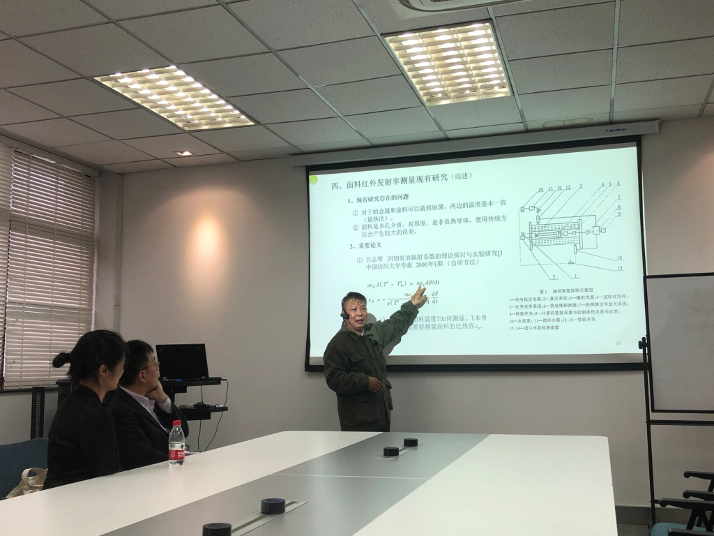 此后,陈益松教授在讲座中为师生阐述了红外发射率在服装热传递中的作用机制,概述了该领域的研究进展。由于织物的红外发射率是影响服装热舒适和热防护的重要物理指标,然而实际应用中织物的红外发射率并不容易测量。陈益松教授详细介绍了两种自行研制的测量方法及相关拓展研究。