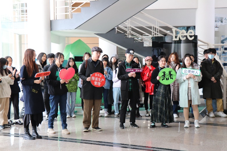 开幕典礼现场,本次展览的参展人员、服装设计与工程系18级的同学们自发组织快闪活动,共同唱响《我和我的祖国》,献礼建校七十周年,将开幕式气氛推向高潮。来自服装企业生产制造及供应链管理领域的校友张明杰、赵军、崔琪、许谊、温韬、晏姿柔、孙颖慧、李逸珺等也通过视频介绍了服装生产管理在工作中的应用,并为课程展送上祝福。