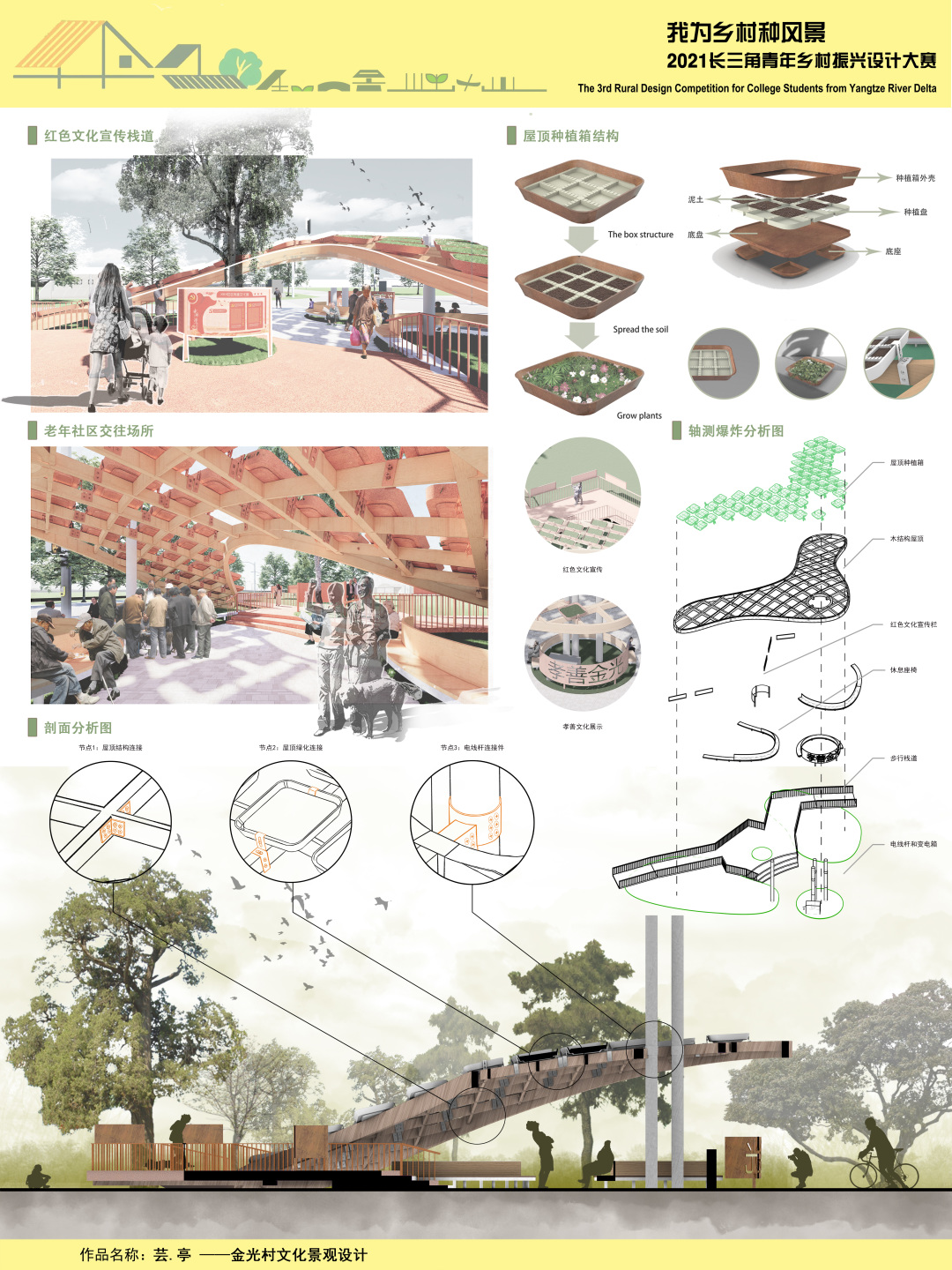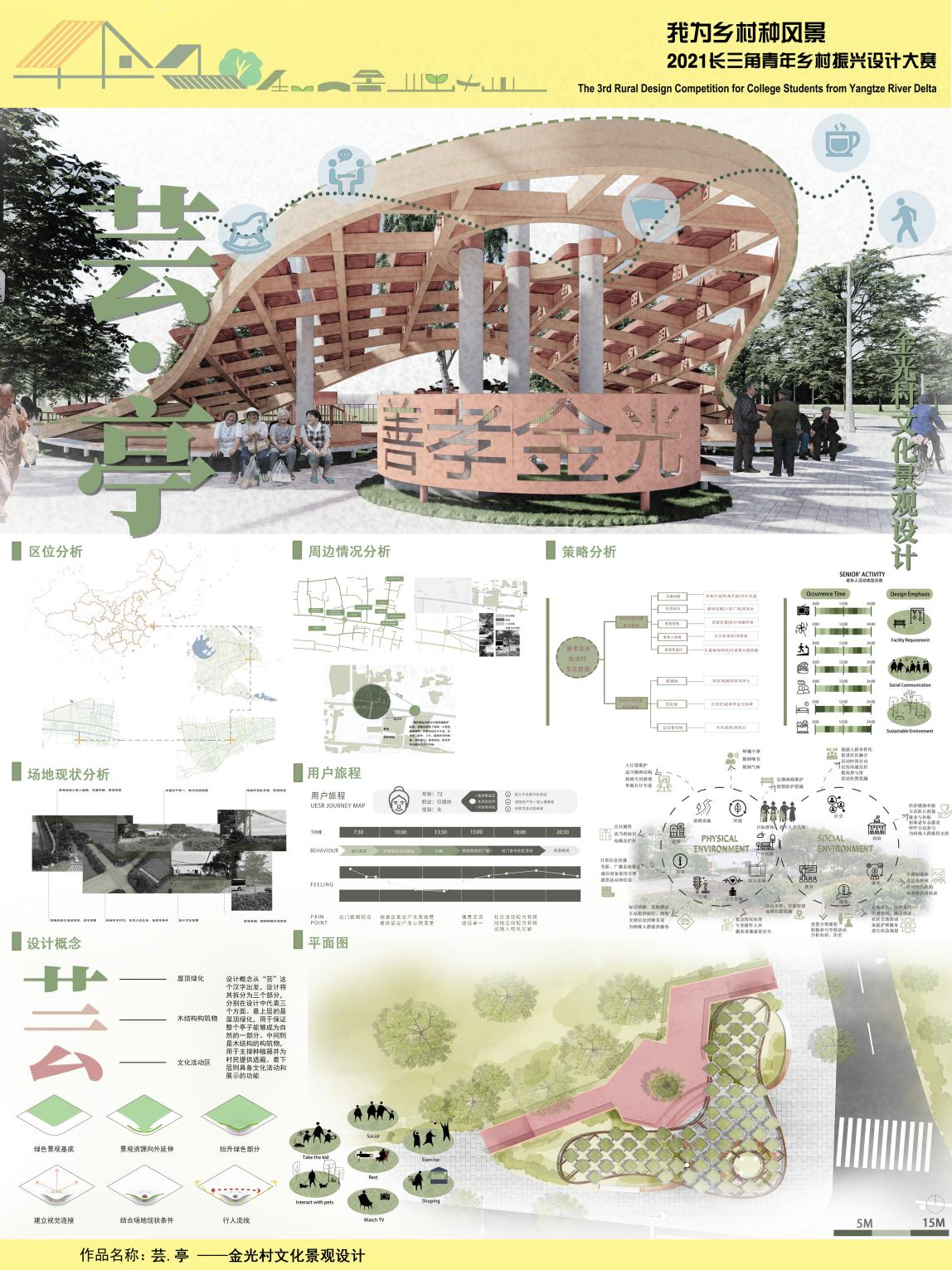 设计概念从“芸”这个汉字出发,将其拆分为三个部分。最上层的是屋顶绿化,这是对乡村自然环境的回应。中间则是木结构的构筑物,用于支撑种植箱并为村民提供遮蔽。底层则能为村民提休闲活动的空间,文化宣传廊道上设置了多媒体展示屏幕,展示了当地的善孝文化。