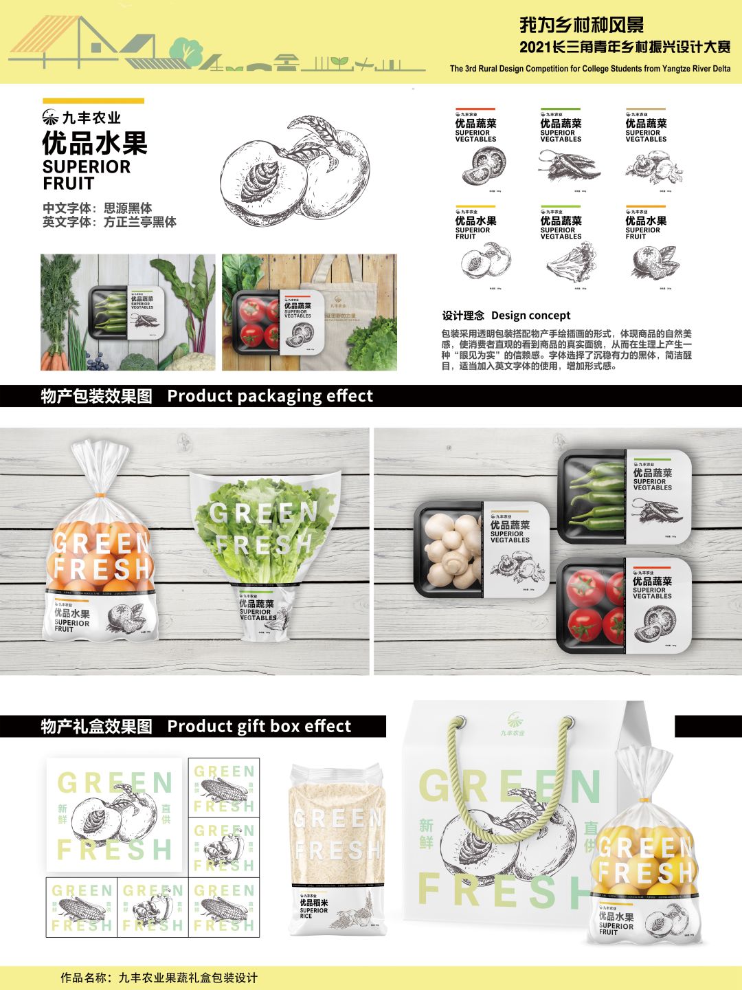 该设计包装采用透明包装搭配物产手绘插画的形式,体现商品的自然美感,使消费者直观的看到商品的真实面貌,从而在生理上产生一种“眼见为实”的信赖感。字体选择了沉稳有力的思源黑体,简洁醒目,适当加入英文字体的使用,增加形式感。